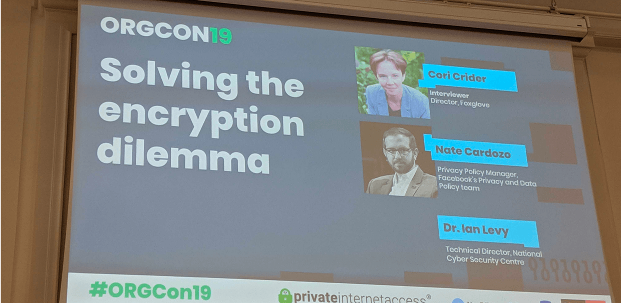 This was perhaps my favourite session, it was really remarkable and speaks to the integrity of the organisers and the whole community. The first thing to notice in the picture is that Dr. Ian Levy is missing a photograph. This is because he was added at the last possible minute. This session was supposed to be a one-on-one interview, where Cori Crider and the audience asks questions of Nate Cardozo, privacy policy manager at Facebook and former senior policy-maker at the Electronic Frontier Foundation (EFF), the biggest digital rights advocacy group in the United States.