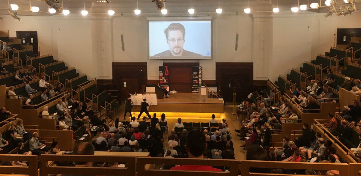 For the first session of the day American whistleblower Edward Snowden gave a keynote speech followed by Q&A, via videocall from Russia. No-one in the room missed the irony of relying on Google’s Hangouts service to talk at a digital rights conference, and the audio was appropriately unreliable. In spite of that Snowden delivered an enlightening, inspiring speech. On discussing his whistleblowing, he made an interesting clarification: That his motivation was about democracy, not about surveillance. What disturbed him more was not the orwellian surveillance of hundreds of millions of innocent people, but the fact that none of them had agreed to it. The fact that there’d been no debate, no chance to object before this policy was implemented. Other highlights from the session: