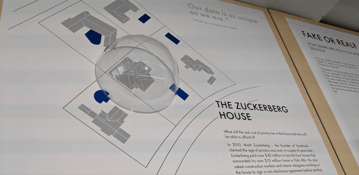 This display demonstrated the amount of land that Mark Zuckerberg has purchased, at great expense, around his home to ensure privacy. The author asks; are we entering a world where only the rich can afford privacy?