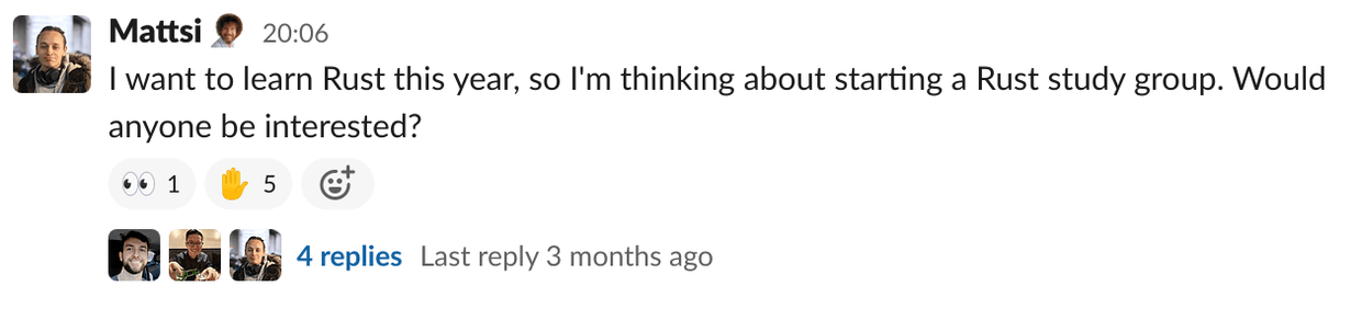 So, based on that I started a study group in January. We meet every other week, regularly get 5-7 people in attendance, read The Rust Book and have fun while we’re at it. It has been great- I feel I’ve easily learned as much about Rust after a few months as I did about F# in all of 2020. So if you have something you want to learn- any kind of skill or knowledge- I suggest looking for others who are interested in it too, from your workplace and among your friends, and studying together.