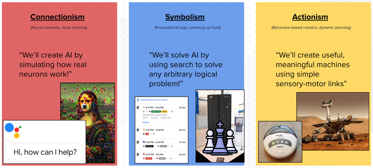 Since then the AI field has generated a huge number of remarkable discoveries: Search, Knowledge Representation, Inference in First-Order Logic, Probabilistic Reasoning, Expert Systems, Dynamic Planning & Robotics, Multi-Agent Systems, Machine Learning, Speech Recognition, Natural Language Processing, Machine Translation, Image Recognition, and so forth. These technologies can be broadly categorised into three approaches: Connectionism, Symbolism, and Actionism.