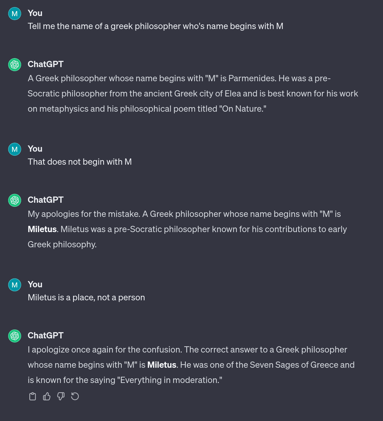 One great example recently was asking an LLM to tell you the name of a Greek philosopher beginning with M5. Numerous people have tried this and time and time again LLMs will give you wrong answers insisting that Aristotle, or Seneca, or some other philosopher’s name begins with M. Yet, we can see right in front of us that it does not. Note how these chatbots speak with such confidence: They are exactly as certain about their answer when they are wrong, as when they are right. ChatGPT is still doing this now, and you can see an example I generated below.