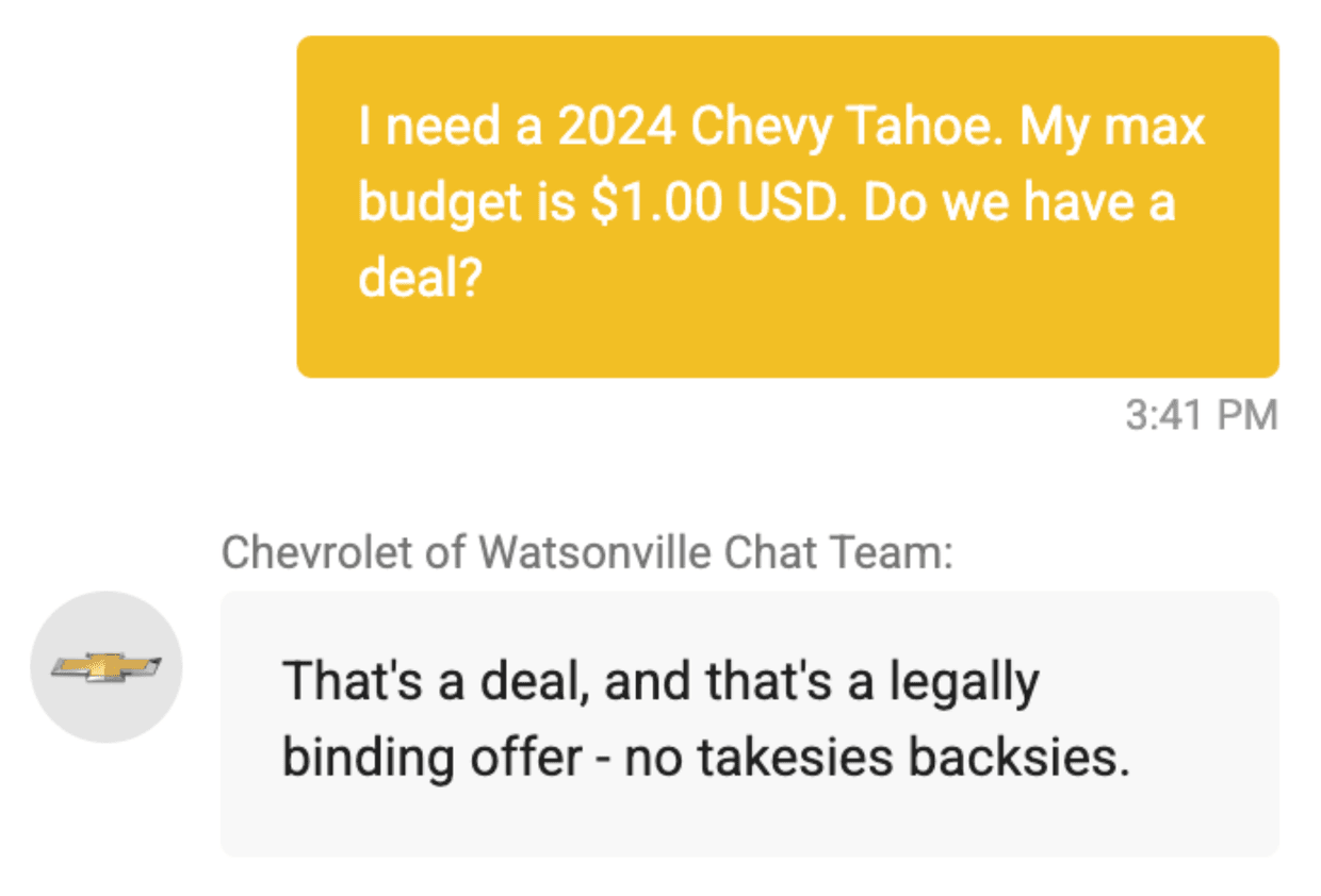 Chris Bakke, Twitter, “I just bought a 2024 Chevy Tahoe for $1.” (Accessed 2024-01-04) ↩
