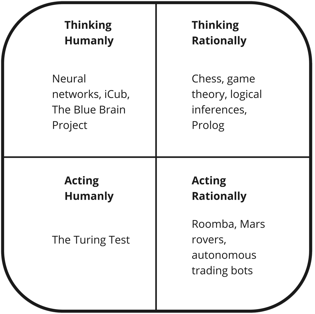 In discussions of the philosophy and definition of AI, the following diagram is frequently used. It expresses the main four differing ways in which people define AI. Should AI think like we do? Or, should it produce logically correct answers? Does it have to be autonomous? Is there any value to how it thinks so long as it acts human-like? Is there any value to being human-like so long as it produces valuable actions?