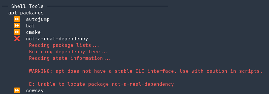 It isolates each individual setup step, grouping related ones together but printing out the results of individual steps as soon as they are finished, so you get immediate feedback. Icons indicate success, skip, or failure. Steps should be idempotent, and skip execution if they can detect that they’ve already run. Console output is swallowed, unless an error occurs:
